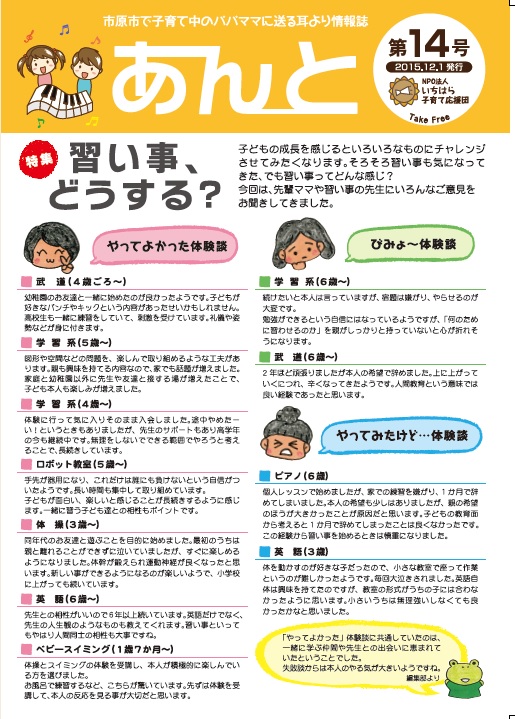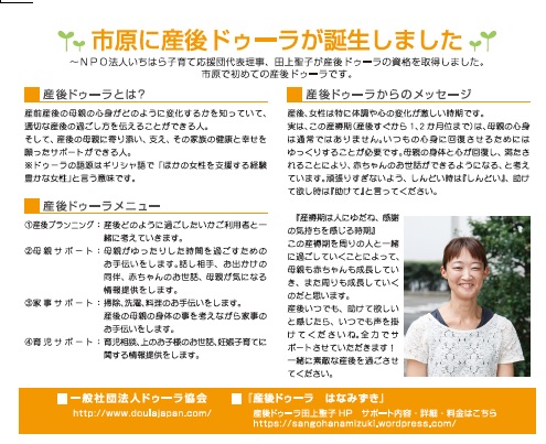市原市を中心に子育て支援をしているNPO法人いちはら子育て応援団の子育て情報誌「あんと」14号に『市原に産後ドゥーラが誕生しました』と掲載されました。