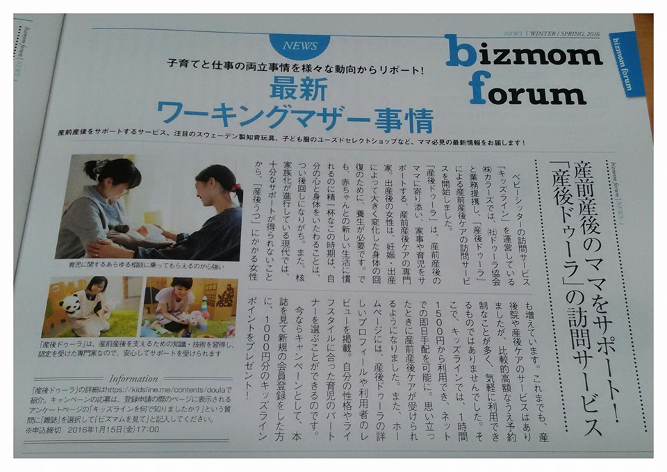 P94 bizmom forum “最新ワーキングマザー事情”のニュース記事(1) に、提携先の(株)カラーズの産前産後ケアの訪問サービスとして
